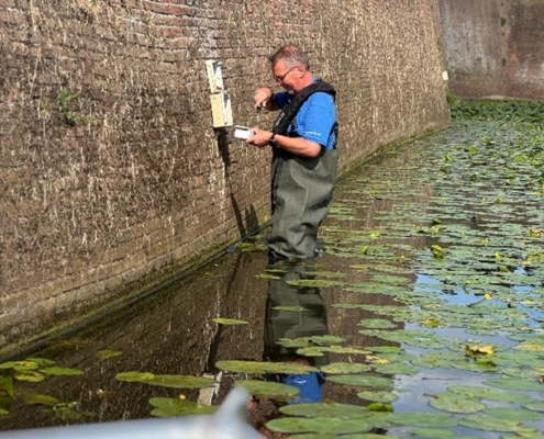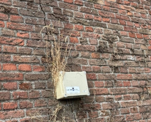 De oostmuur vroeg om extra aandacht. Het omringende water maakte het werk uitdagender, maar bood ook een oplossing: per boot konden we eenvoudig dichtbij komen. Met digitale meters bewaken we de scheuren in de muur. Deze slimme meters zijn gekoppeld aan ons netwerk en houden ook rekening met bijvoorbeeld temperatuur. In totaal hangen er zes scheurmeters bij de citadel. Waar de citadel vroeger waakte over de stad, waken wij nu een beetje over de citadel.